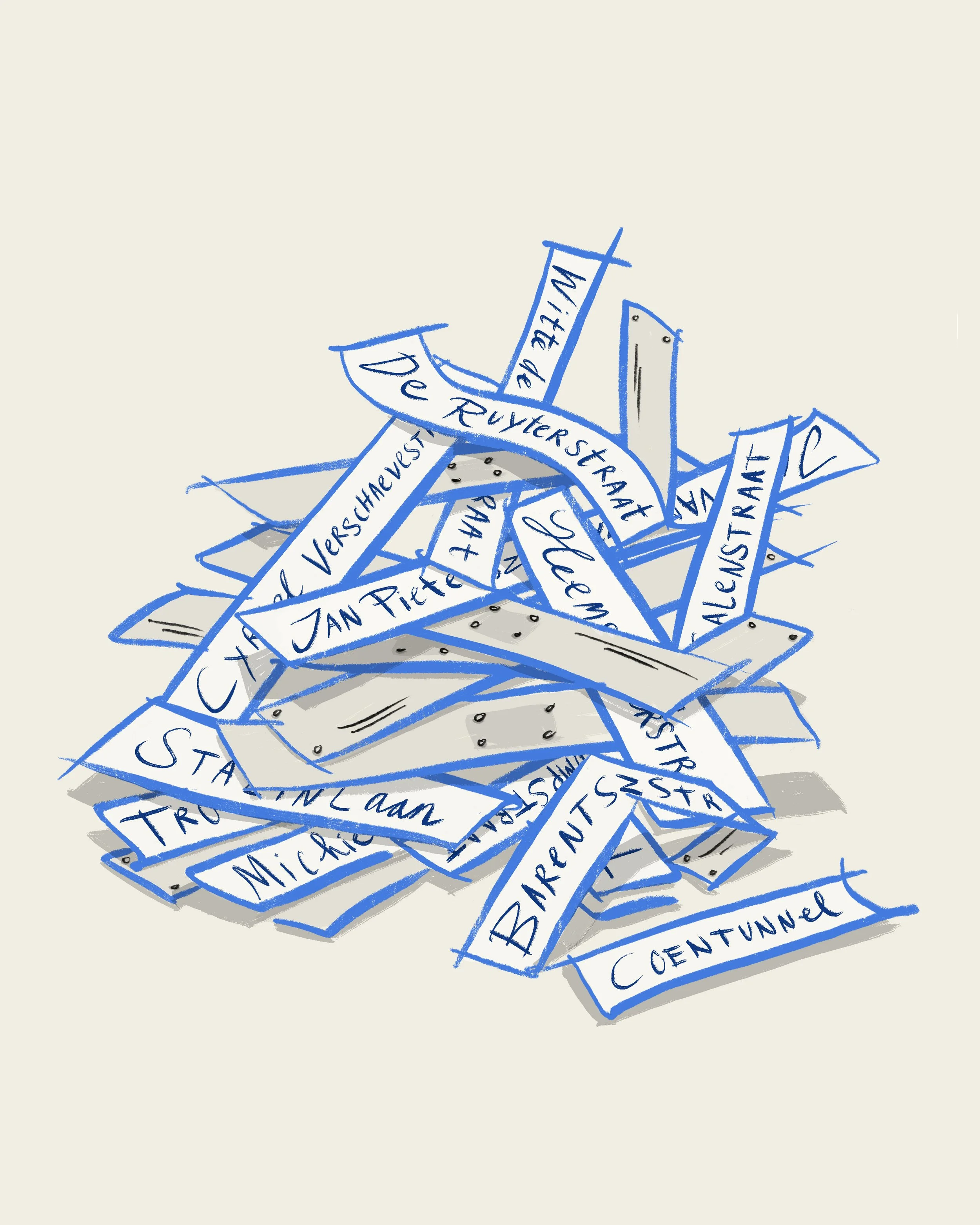 Begin 2024 illustreerde ik de cover van het taligste tijdschrift dat er bestaat: Onze Taal. Deze keer over het straatnamenbeleid, een herkenbaar thema voor mij omdat ik lang in het Zeeheldenkwartier heb gewoond. Of moet ik zeggen: Zeeschurkenkwartier?