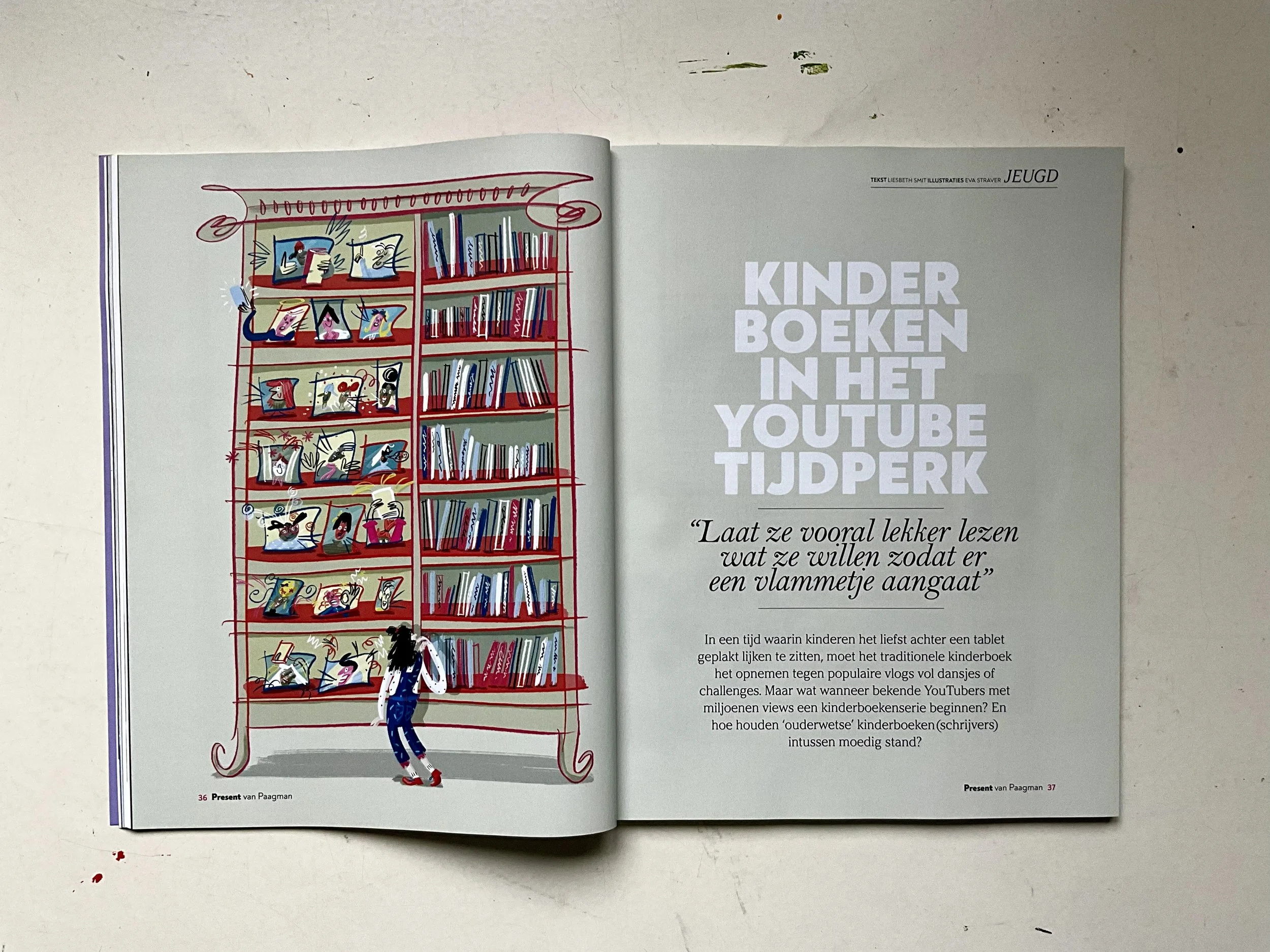 In 2023 maakte ik de illustraties voor het najaarsglossy van Paagman. Ik illustreerde de zes katerncovers, die steeds een nieuw katern inluiden en de meest smeuïge inhoud aankondigen, en ook de illustraties bij het artikel ‘Kinderboeken in het Youtube-tijdperk’.