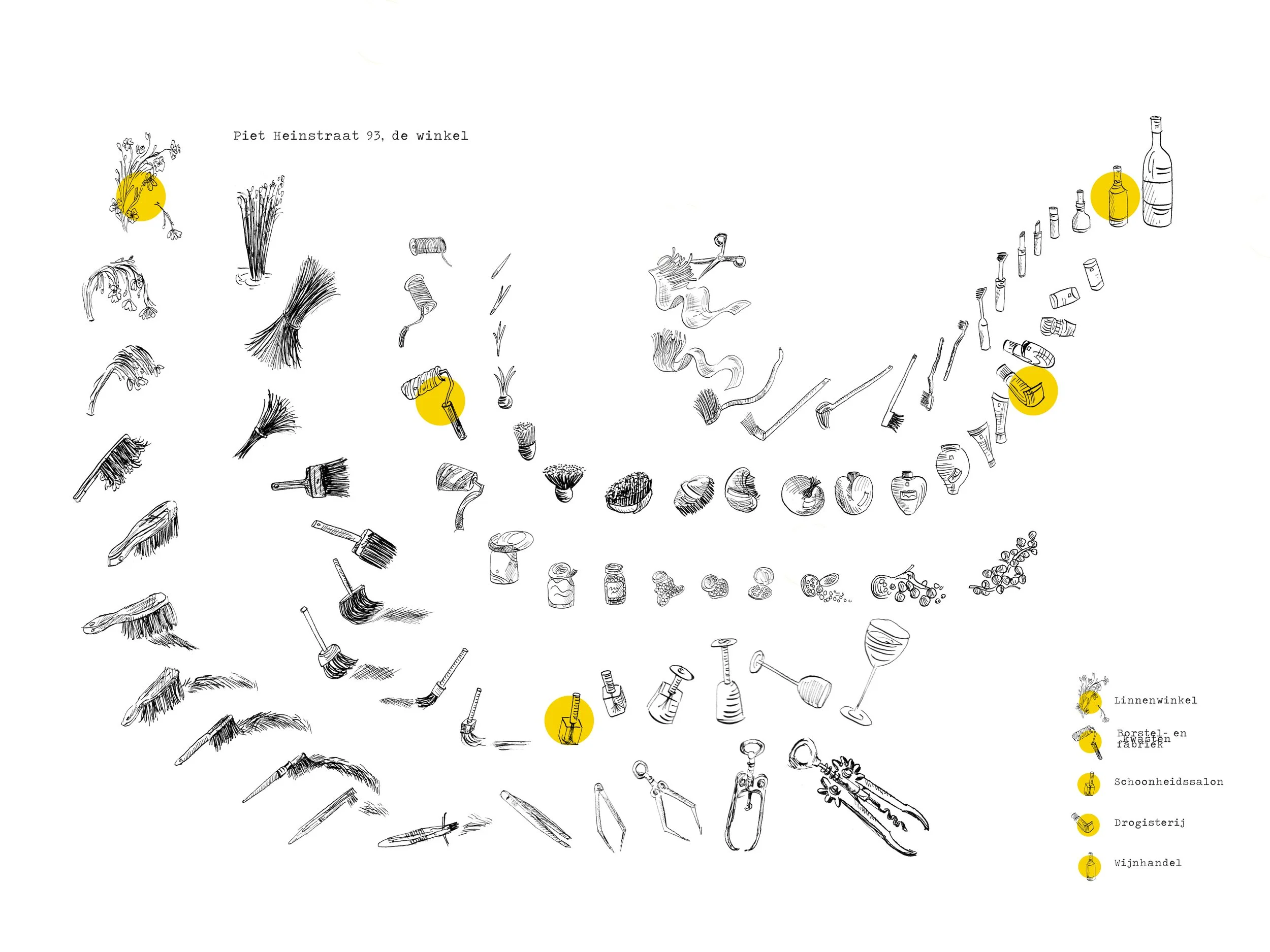 Na het speurwerk begon de uitdaging op artistiek vlak: het vormgeven van ontwikkeling en geschiedenis in illustraties. Een van de mooiste momenten van mijn onderzoek vond ik het bezoek aan het bouwtekeningenarchief. Dat is de reden waarom ik een blauwdruk heb gemaakt van het huis. Hierin komen verschillende tijden samen. Tijdens de expositie in de HKU Loods in Utrecht wilde ik de bezoekers een indruk geven van wat dat is, historisch onderzoek doen. Daarom verwijzen de nummertjes op de blauwdruk naar de inhoud van een klein archiefje. In de genummerde hangmapjes waren tientallen illustraties te vinden die meer informatie onthulden over allerlei onderwerpen.